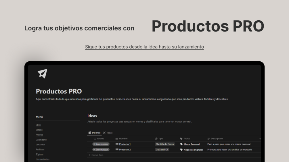 Productos PRO es una plantilla de Notion diseñada para ayudarte a gestionar tus productos de manera eficiente desde la captación de ideas hasta su lanzamiento.